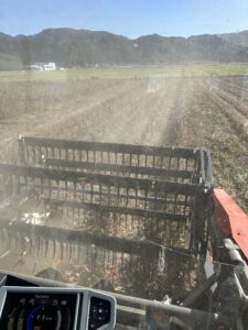 大豆の刈り取りスタート‼️ 2025年10月23日 最終更新日時 : 2025年10月23日 shimazakinouen1584 今日はめちゃくちゃ秋晴れです。 朝は寒いですが日中は太陽があると少し暑いです 大豆はお天気もよくて乾燥してるのですごいホコリです